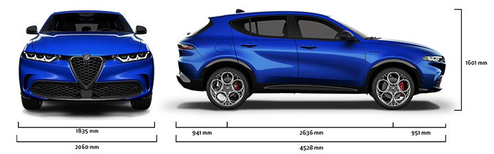 Der Alfa Romeo Tonale misst 4.528 mm in der Länge, 1.601 mm in der Höhe und 2.060 mm in der Breite. Sein italienisches Design und der moderne Alfa Romeo-Stil werden durch diese Abmessungen perfekt unterstrichen. Er ist mit Leichtmetallfelgen in den Größen 18'', 19'' und 20'' erhältlich.